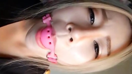 Super-cute and cute blonde female with a gag ball in her throat taunts camera