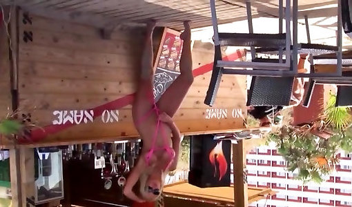 Red-hot brunette in micro bathing suit stretching