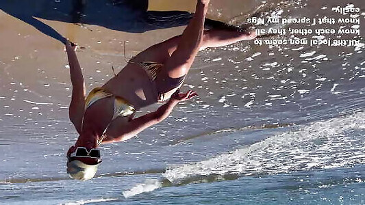 Slut makes fun of her husband on the beach