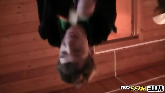 Dark-hued xxl guy plays with a teenie school nymph in sauna