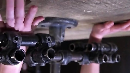 Raven haired sub in iron implement restrain bondage