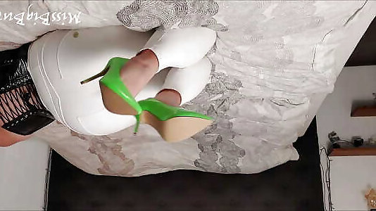 BWB MissBigButt dressed in frateenity muscle high heel bevy with white freddy leather maturl weman and black spandex corsage in sofa