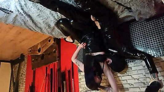 2 Domme Punishes A Lone Gimp