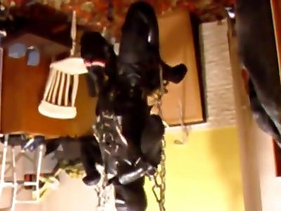 doll strapped in latex protection hooded gagged played by sir