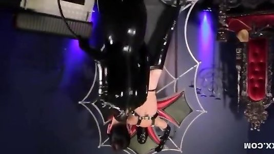 Latex domina belt cock pegs Sadism & Masochism sub in suspension restrain bondage