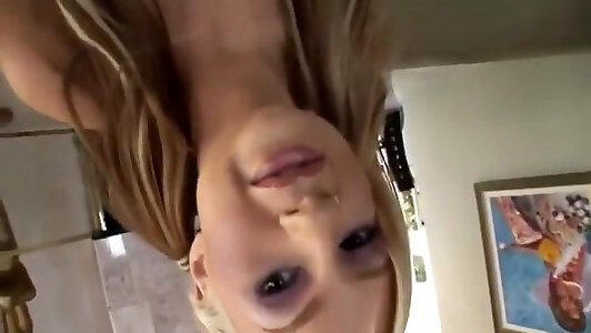 Pigtailed blonde honey is getting on all fours and sucking her roomies rod, hoping to get a facial cumshot