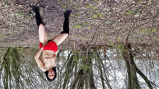 Beautiful cute girl Assol sunbathes on river bank on wild beach in a dress without panties and naked in public Outdoors Outside