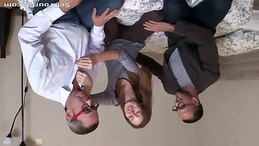 Dark-haired Domme orders her orgy gimp to slurp her beaver