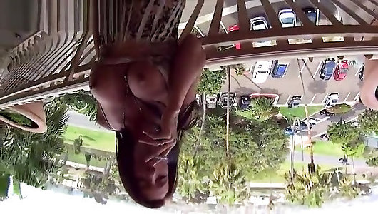 Dominatrix smokes on the balcony and uses a man as her ashtray