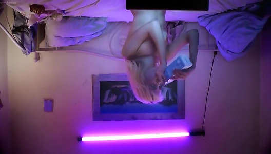 Towheaded white chick inhales and bangs in rainbow lingerie