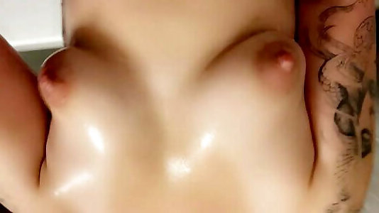 Young dame with turgid puffies wanks in the shower