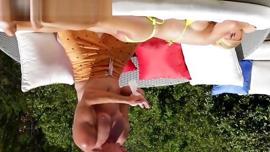 Bigboobed cougar wanks bloke in pool