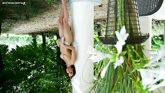geschmeidige dunkelhaarige zieht sich im freien aus ihrer milchigen satin-unterwäsche aus