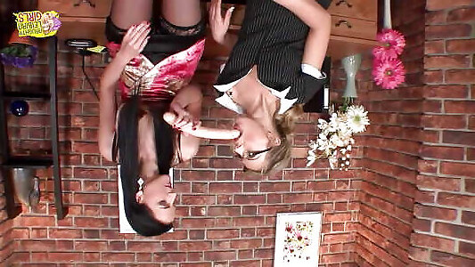 positionnant un doigt dans la bouche de son amant avant que la fille plonge un gode dans sa fente nacrée blanche