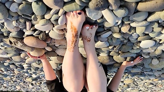 बड़ी प्राकृतिक स्तन और सही पैर-भव्य मालकिन लारा सार्वजनिक समुद्र तट पर खुद को छू लेती है