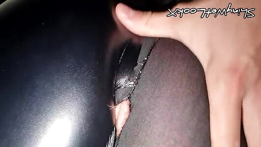 bang in brillante pelle stretch pantaloni e sperma sul culo